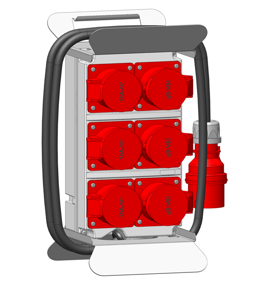 Obudowa pozwala na montaż 6 gniazd z typoszeregu przemysłowego CEE 16A-32A, również 3P używanych na campingach czy w marinach oraz standardowych gniazd GK 230V (z kołkiem ochronnym), w dowolnej konfiguracji.